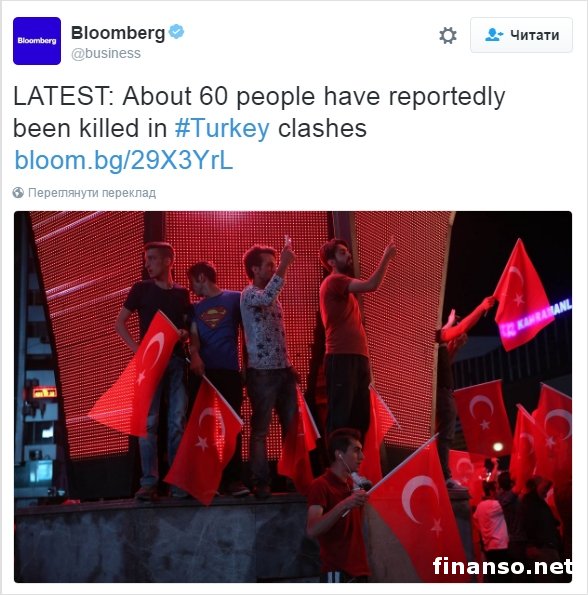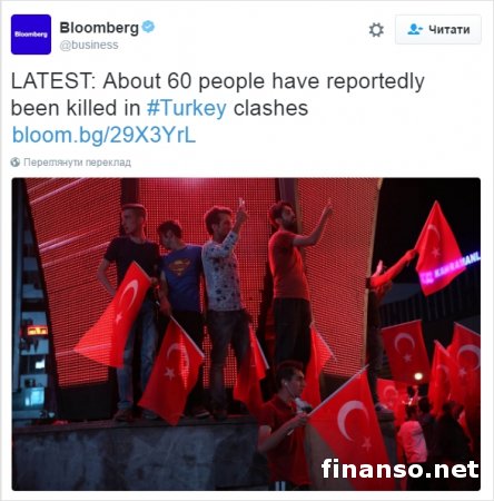 Как удалось выяснить корреспондентам новостного интернет-портала «Украина сегодня: Finanso.net», по информации Bloomberg, в результате попытки осуществить переворот в Турции сообщается о 60 погибших. Ранее сообщалось о 130 арестованных солдатах и 17 погибших сотрудниках полиции. Напомним, что в ночь на 16 июля в Турции произошла попытка военного переворота, которая за несколько часов была подавлена. Премьер-министром Турции Бинали Йылдырымом сообщалось, что число задержанных повстанцев в стране достигло 336 человек. По информации источников, по подозрению в попытке переворота в Турции, арестовывают высокопоставленных чиновников. В частности, был задержан контр-адмирал и министр развития страны. Сдались в плен в Стамбуле сразу 50 военнослужащих, блокировавших мост через Босфор. Как это уже сообщалось, вечером 15 июля в Турции начался военный переворот. Военными было заявлено о захвате власти и задержании руководства страны. Однако уже к 04:00 (по Киеву) президент Турции Р. Эрдоган заявил о провале попытки путча. При этом сообщения о стрельбе и противостоянии в Анкаре и Стамбуле продолжали поступать. О взятии ситуации под контроль заявил президент Турции Р. Эрдоган.Р. Эрдоган заявил тем временем сторонникам, что ситуация практически взята властями под контроль. Вместе с тем он призвал не уходить с улиц и площадей, пока обстановка не стабилизируется. По информации одного из западных информагентств, в ходе своего выступления по прибытии в аэропорт Стамбула, президент Турции Реджеп Эрдоган обнародовал имя организатора военного переворота. В аэропорту Стамбула турецкий лидер Р. Эрдоган дал пресс-конференцию, на которой назвал исполнителей переворота в стране. Организаторами случившегося, по словам лидера Турции, являются сторонники исламского общественного деятеля, писателя и бывшего имама и проповедника, находящегося в добровольном изгнании в США – Фетхуллаха Гюллена. Исполнители переворота, по заявлению Р. Эрдогана, получали приказы. Турецкий президент при этом добавил, что организовавшая переворот в стране группа военных заплатит за все это высокую цену. |