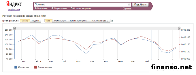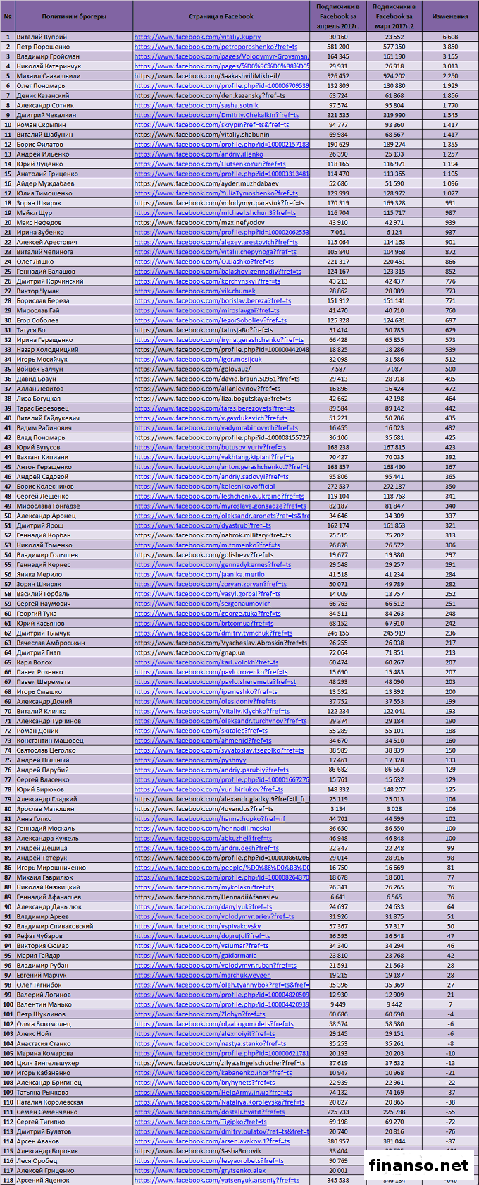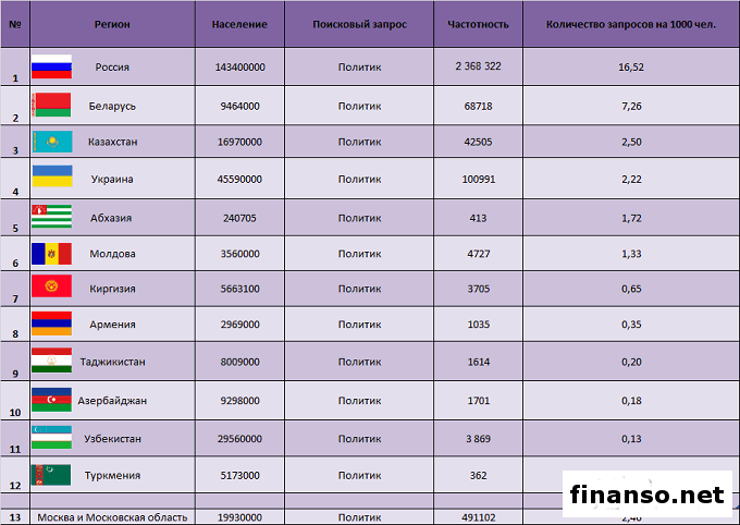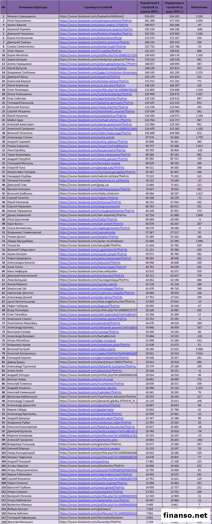 На сегодня социальная сеть Facebook – это не просто кладезь полезной инфо, но и отличный способ узнать о самых свежих событиях.При этом часто пользователи соцсети начинают узнавать новости и от политиков, и от блогеров, а не только от своих реальных друзей. Какие же самые популярные политики и блогеры Украины в социальной сети Facebook, проанализировали маркетологи ведущего рекламного агентства E-iq специально для журнала "Биржевой лидер". 118 самых популярных политиков и блогеров в соцсети Facebook в апреле 2017 года. Чтобы определить самые популярные аккаунты украинских блогеров и политиков, "Биржевой лидер" применил простую, но проверенную и надежную схему: подсчитал число подписчиков в аккаунтах участников рейтинга. Именно это число и является индикатором популярности блогера/политика, который необходимо учитывать. Из табличных данных видно, что: - первое место по популярности среди украинских политиков и блогеров в соцсети "Фейсбук" занимает Михаил Саакашвили, экс-председатель Одесской областной госадминистрации. Количество его подписчиков - 926 452 человека; - второе место занимает Петр Порошенко, действующий президент Украины, с 581 200 подписчиками; - третье место принадлежит Арсену Авакову, министру внутренних дел Украины, с 380 957 подписчиками; В первую десятку лидеров данного рейтинга также входят: - Арсений Яценюк - 345 538 подписчиков; - Дмитрий Чекалкин - 321 535; - Борис Колесников - 272 537; - Дмитрий Тымчук - 246 155; - Семен Семенченко - 225 733; - Олег Ляшко - 221 317; - Борис Филатов - 190 629. Какие изменения по числу подписчиков у политиков и блогеров Facebook Украины произошли в апреле? Судить о популярности за конкретный период политика или блогера в Facebook можно, основываясь на разнице в подписчиках на начало и конец периода. В нашем случае сравниваем число подписавшихся и отписавшихся читателей страницы за прошедший месяц. В десятку лидеров по количеству подписавшихся на страницу за месяц в Facebook входят: - Виталий Куприй - на 6 608 подписчиков в апреле больше, нежели в марте 2017 года; - Петр Порошенко - 3 850; - Владимир Гройсман - 3 155; - Николай Катеринчук - 3 013; - Михаил Саакашвили - 2 250; - Олег Пономарь - 1 929; - Денис Казанский - 1 856; - Александр Сотник - 1 770; - Дмитрий Чекалкин - 1 545; - Роман Скрыпин - 1 417. Негативная тенденция, и те, от кого отписываются подписчики, представлены следующими блогерами и политиками: - Петр Шуклинов – на 4 подписчика меньше; - Ольга Богомолец -6; - Алекс Нойт -6; - Анастасия Станко -8; - Марина Комарова -10; - Циля Зингельшухер -13; - Игорь Кабаненко -21; - Александр Бригинец -22; - Татьяна Рычкова -37; - Наталия Королевская -38; - Семен Семенченко -55; - Сергей Тигипко -72; - Дмитрий Булатов -76; - Арсен Аваков -87; - Александр Боровик -121; - Леся Оробец -135; - Алексей Гриценко -202; - Арсений Яценюк -646. Популярность запроса "политик" в поисковой системе Яндекс в апреле 2017 года. Самым популярным запрос "политик" оказался у жителей следующих стран: -Россия - 16,52 запроса из расчета на одну тысячу населения страны; -Беларусь - 7,26; - Казахстан - 2,50; - Украина - 2,22; - Абхазия - 1,72; - Молдова - 1,33. Далее следуют: - Киргизия - 0,65 запроса на 1000 человек; - Армения - 0,35; - Таджикистан - 0,20; - Азербайджан - 0,18; - Узбекистан - 0,13; - Туркмения - 0,07. Популярность запроса "политик" среди жителей Украины. Жители Украины интересовались запросом "политик" в поисковой системе Яндекс в феврале 100 991 раз. Вместе с данным запросом они также искал