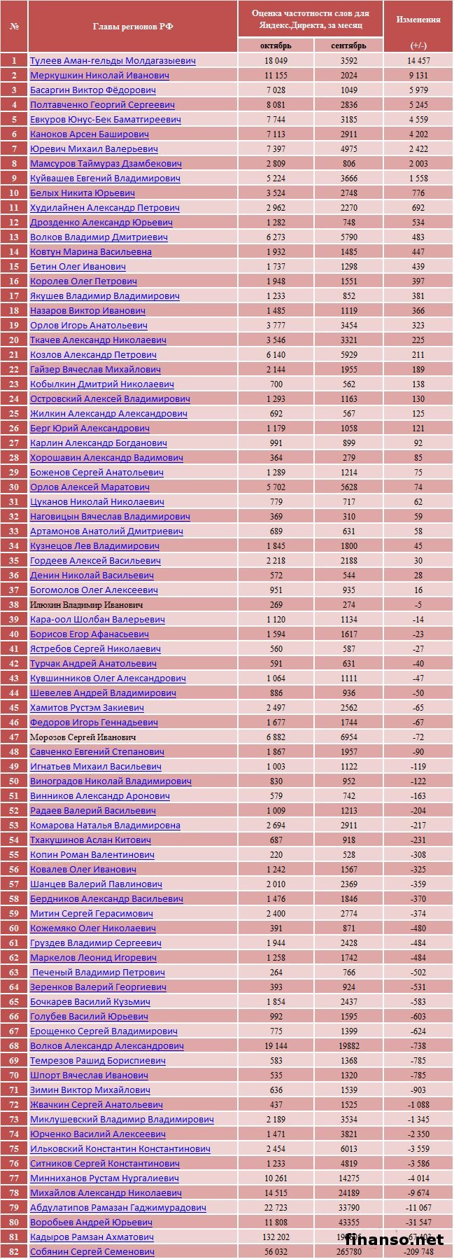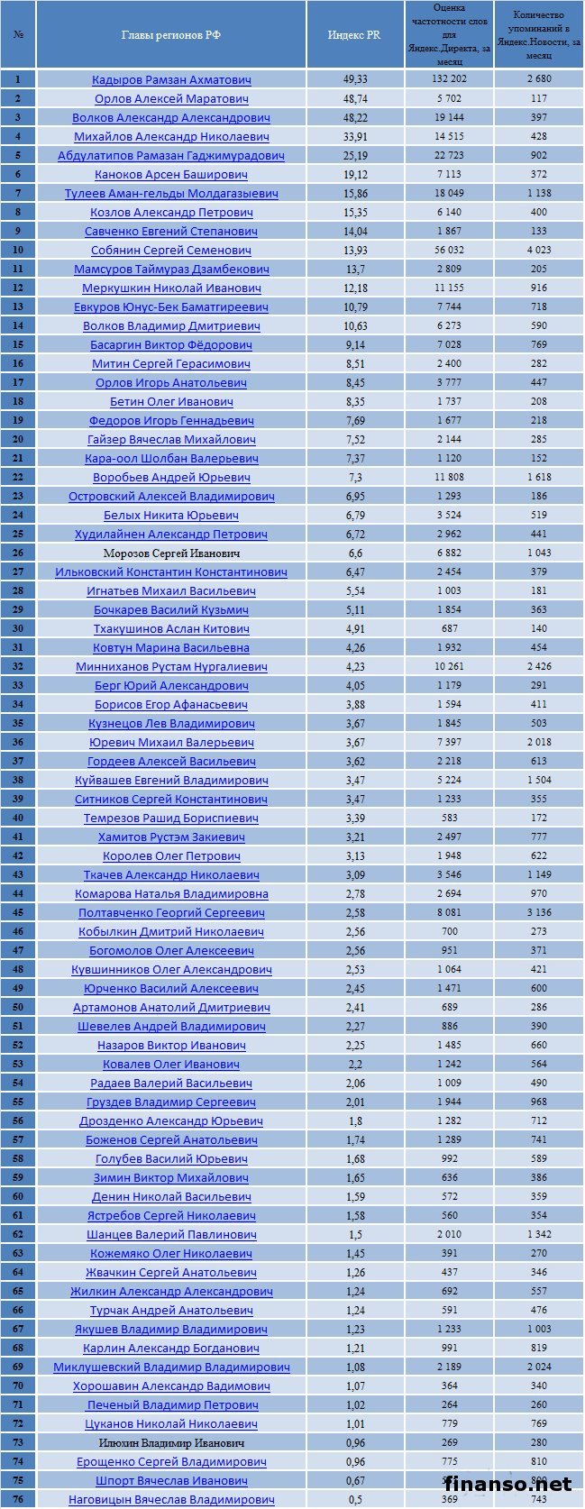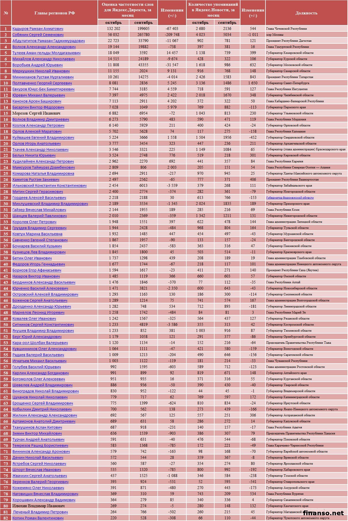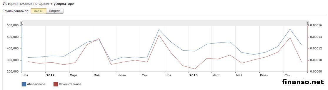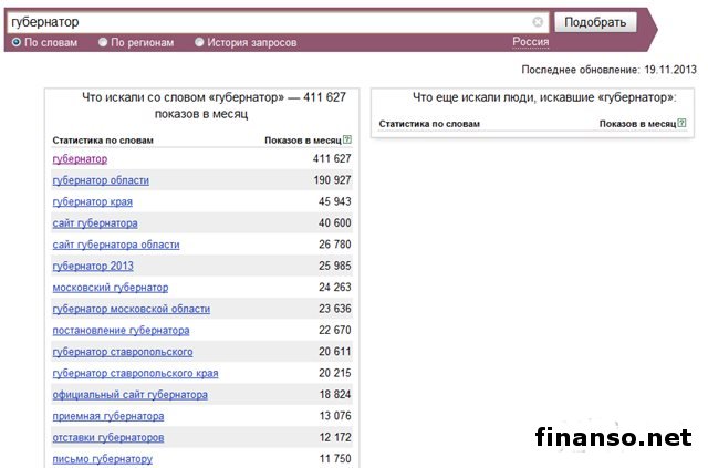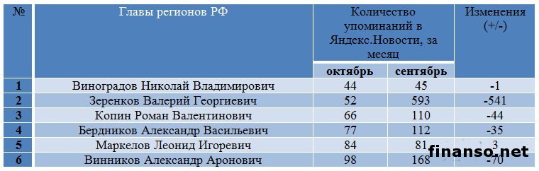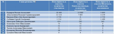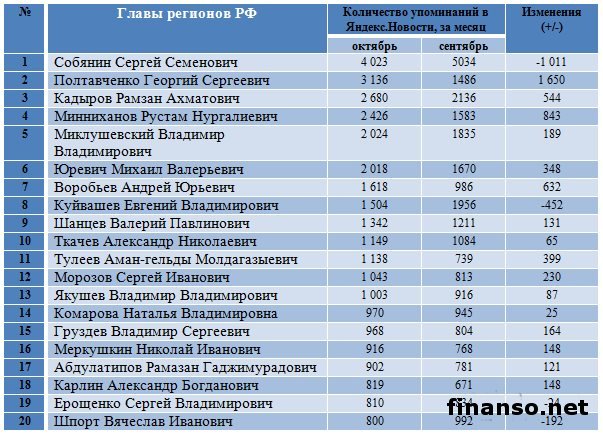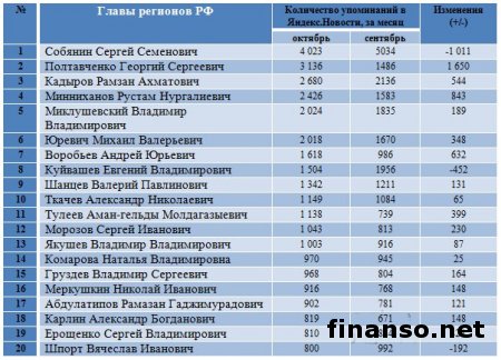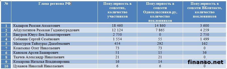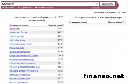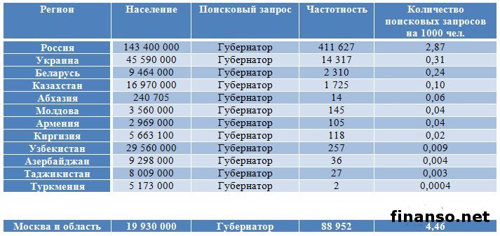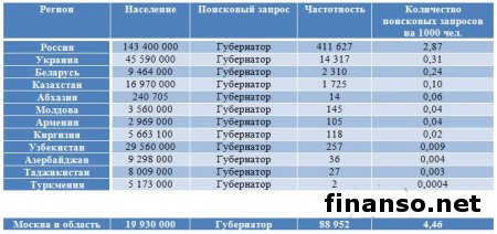 Также сложной задачей становится составление рейтинга губернаторов Российской Федерации на основе объективного критерия, который без труда можно проверить и выяснить, у кого из губернаторов падает уровень популярность, а у кого растет и каковы причины этого. Кто из глав регионов страны является самым интересным пользователям Интернета? - разбирались аналитики журнала "Украина сегодня: finanso.net". Рамзан Кадыров – самый популярный губернатор РФ в Интернете.Рейтинг популярности глав регионов России составлялся аналитикfvb журнала "Украина сегодня: finanso.net" на основании 3-х базовых критериев: - оценка частотности слов для Яндекс.Директа за месяц, рассчитанная при помощи сервиса wordstat.yandex.ru; - частота упоминаний о губернаторах, рассчитанная с помощью агрегатора news.yandex.ru (Яндекс.Новости); - регион анализа (а значит, и поиска в сервисе wordstat.yandex.ru) – Россия. Первое место популярности в Интернете в этот раз завоевал Рамзан Ахматович Кадыров (132 202 запросов в поисковой системе Яндекс за месяц), губернатор Чеченской республики, высокий рейтинг которого можно объяснить его яркостью и неординарностью в поведении и экстравагантностью в принятии решений. На второй строчке рейтинге популярности - Собянин Сергей Семенович (56 032 запросов в поисковой системе Яндекс за месяц), который резко потерял своих поклонников. Он уже более трех лет занимает кресло мэра Москвы, является одним из лидеров партии "Единая Россия", членом президиума московского Регионального совета партии, входит в Высший совет ЕР. Третья ступень рейтинга досталась Абдулатипову Рамазану Гаджимурадовичу (22 723 запросов в Яндекс за месяц), который является Президентом республики Дагестан, депутатом Государственной думы, доктором философских наук, профессором и дипломатом. Аутсайдерами ТОПа популярности глав регионов России в этом месяце стали: - Наговицын Вячеслав Владимирович - Хорошавин Александр Вадимович - Илюхин Владимир Иванович - Печеный Владимир Петрович - Копин Роман Валентинович Какие изменения произошли с популярностью губернаторов в октябре?Уровень популярности губернаторов России зависит от принятых решений, активности в сфере PR, рекламы и других факторов. Вот как показатели количества запросов изменились в октябре по сравнению с предыдущим месяцем: Исходя из данных таблицы, можно сделать следующие выводы: 1. Лидером данного рейтинга по увеличению количества запросов за месяц стал Тулеев Аман-гельды (+14 457 запросов в поисковой системе Яндекс). 2. Самое большое падение показателя оказалось у Сергея Собянина (-209 748 запросов за месяц), но несмотря на это, он занимает высокие позиции популярности. Россияне интересуются губернаторами чаще украинцев и белорусов.Популярность каждого губернатора тем или иным образом зависит от уровня интереса потребителей к этой области в целом в Интернете. Хотя в последнее время этот показатель начал резко сокращаться. Данные сервиса wordstat.yandex.ru свидетельствуют о том факте, что россияне довольно часто интересуются в Интернете губернаторами: Как видим из данных таблицы, россияне вводили поисковый запрос в Яндексе "Губернатор" 411 627 раз в октябре согласно данным сервиса wordstat.yandex.ru. Для сравнения: - жители Украины при населении 45 590 000 чел. сделали 14 317 запросов; - жители Беларуси при населении 9 464 000 чел. искали 2 310 раза; Наибольшее же количество з