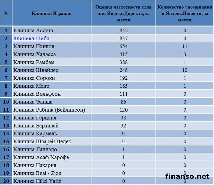 Израиль по праву можно назвать медицинской столицей мира, ведь в этой стране работает примерно 200 клиник, которые предлагают высококлассное лечение. Множество пациентов из стран восточной Европы и СНГ посещает эту страну для прохождения диагностики всего организма, хирургических операций, специализированного лечения и различного медицинского обслуживания. И это неспроста, новостное агентство "Украина сегодня: finanso.net", рассказало, что уровень медицинского обслуживания в клиниках Израиля зачастую превышает уровень других развитых стран, а цены на него более демократичные.Кроме того, большинство израильских врачей владеет русским языком, что избавляет русскоговорящих пациентов от каких-либо неудобств, которые могут возникнуть во время лечения за границей. В вопросе популярности клиник Израиля среди граждан СНГ разобрались аналитики издания "Биржевой лидер". Рейтинг израильских клиник в Интернете.Этот рейтинг основан на двух критериях поисковой системы Яндекс, которые могут дать объективные результаты. Первое место в этом рейтинге заняла клиника "Ассута" – крупный медицинский комплект в городе Тель-Авив, он считается одним из самых совершенных по уровню лечения, а также обладает собственным медцентром. Его основные направления: общая хирургия, кардиология, гинекология и ЭКО. На втором месте находится клиника "Шиба" – израильская государственная больница. Она находится неподалеку от города Тель-а-Шомер и включает в себя три независимых медицинских учреждения: детскую больницу Сафра, общую больницу и клинику реабилитации. Третье место заняла клиника "Ихилов", она является крупным и прогрессивным медицинским учреждением, которое может предоставить полный спектр услуг, и проводящее научные исследования в области здравоохранения. Рейтинг заболеваний, которые чаще всего ищут россияне для лечения в Израиле.Исходя из поисковых запросов в сервисе Яндекс, чаще всего россияне ищут информацию по таким заболеваниям как: · Лечение грыжи в Израиле – 170 поисковых запросов за месяц; · Лечение в Израиле позвоночника – 175 запросов; · Лечение суставов Израиль – 215 запросов; · Израиль лечение псориаза – 474 запроса; · Лечение в Израиле Мертвое море – 584 запроса; · Лечение рака Израиль – 1293 запроса за месяц. Одним из первых запросов в рейтинге стало запрашивание "Лечение рака в Израиле" по той причине, что в Израиле используют новейшие методики, и работают настоящие профессионалы. |